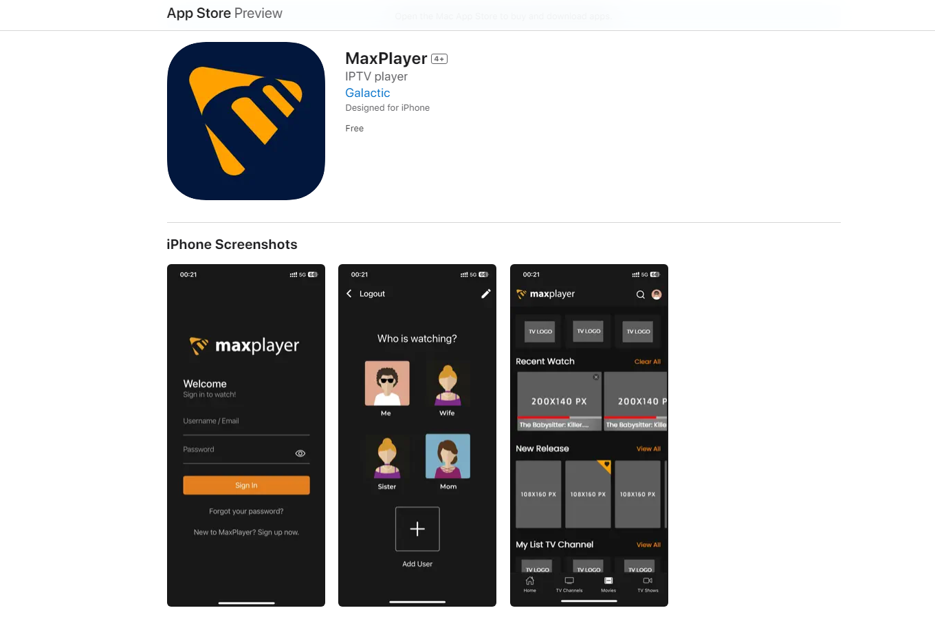 For iOS (iPhones), you can find us on the Apple App Storetype: MaxPlayer or go to link: https://apps.apple.com/us/app/maxplayer/id1660982028